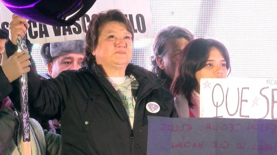 En primera fila sobre un escenario montado en la caja de un vehículo de gran porte, Gloria lloró cuando se entonó el Himno Nacional y luego la canción “Venceremos” interpretada por María Elena Walsh, tras lo cual, tomó el micrófono y se dirigió a los presentes, muchos de los cuales llevaban pancartas y globos y pañuelos rosas, ya que ese era el color preferido de Cecilia.
